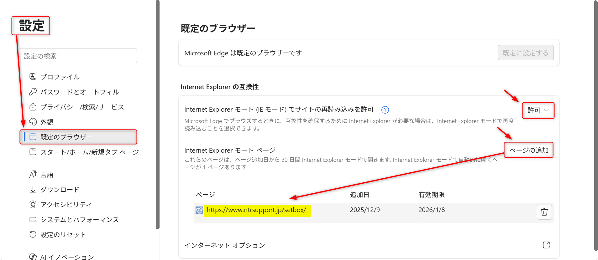 3. IEモード対象に https://www.ntrsupport.jp/setbox を追加